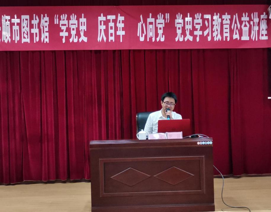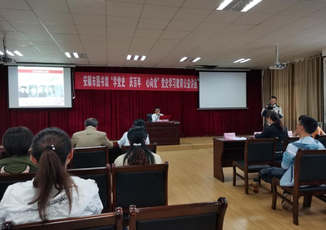 为庆祝中国共产党成立100周年,持续贯彻党史学习教育工作要求,6月11日下午,安顺市图书馆“学党史 庆百年 心向党”党史学习教育公益讲座开讲了。邀请中共安顺市委党校科研部负责人、副教授罗强作专题授课,市文旅系统各基层单位代表、市图书馆全体干部职工、社区干部、读者代表等参加讲座。