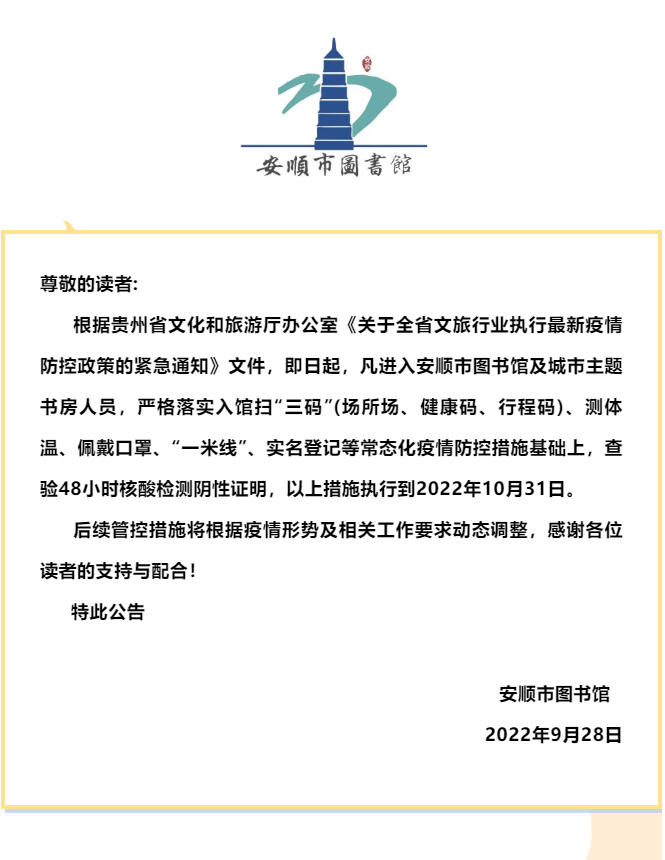 下一篇:安顺市图书馆2022年国庆假期开放时间安排