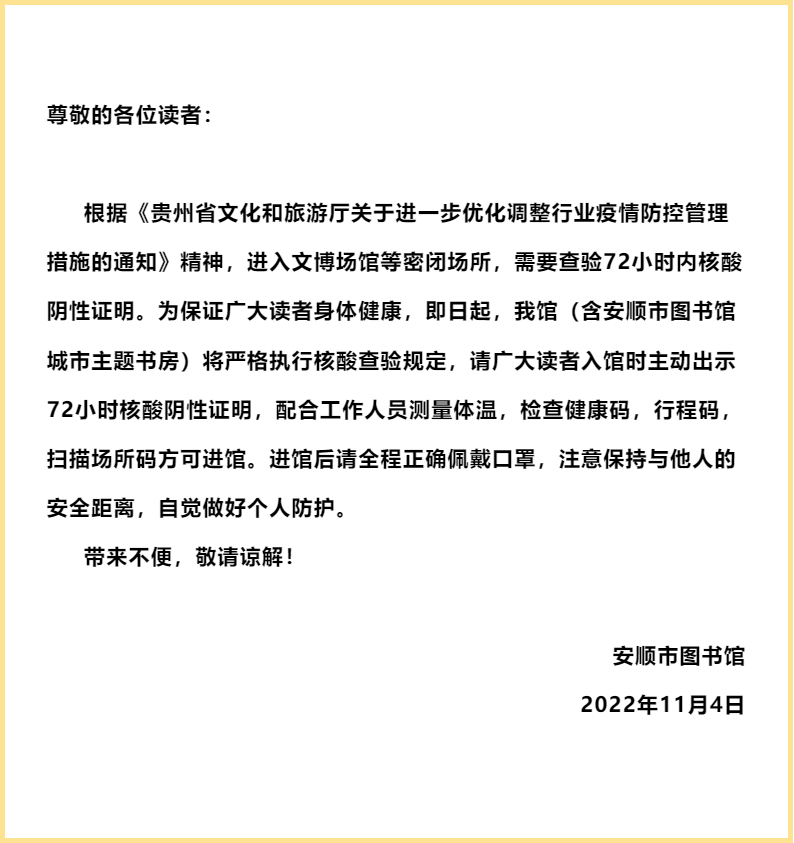 通知 | 安顺市图书馆入馆需出示72小时内核酸阴性证明
